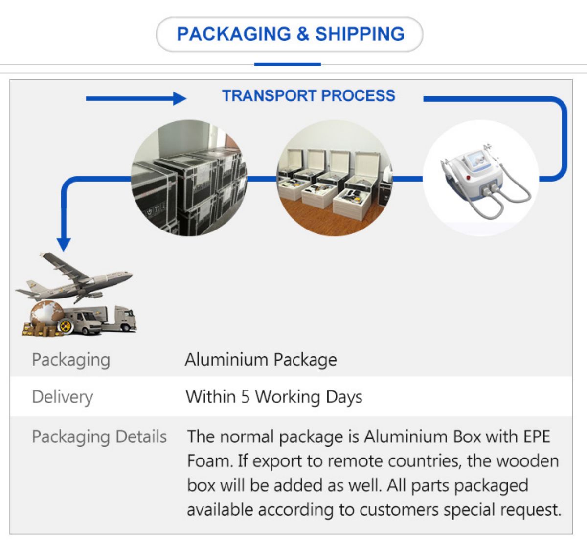 2) Painless: new AFT technology (Advanced Fluorescence Technology) uses low and equal energy. The special filter cut s 950-1200nm wavelength, which is useless in treatment and absorbs water to make patient feel painless